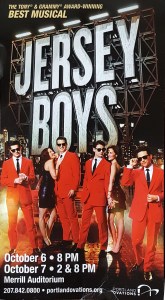I spent yesterday afternoon with 1,699 other souls at a sold out performance at Merrill Auditorium in Portland, ME. While waiting in the lobby, I couldn’t help but notice snowy heads, frail bodies, plenty of hearing aids and canes and even a scooter or two. I thought I mistakenly wandered into an AARP convention. Then I looked in the mirror and realized these patrons were there for the same reason I was … to take in the spectacular story of the rise and career of the Four Seasons — later Frankie Valli and the Four Seasons. The Jersey Boys.