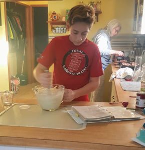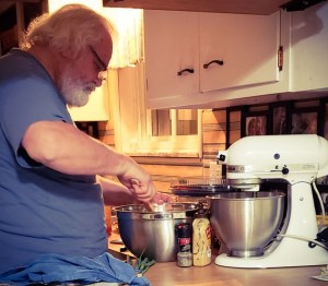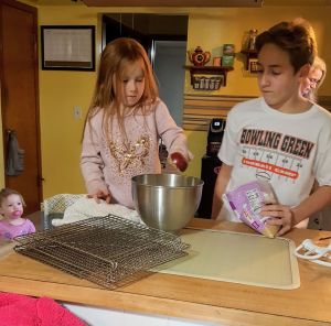 First night, I was pampered and entertained by my grandsons and great-granddaughters. Gavin made Friday morning waffles while Dee tended the bacon, and Gavin and Addi (Harper in the background) assembled ingredients for double chocolate chip cookies. Ryan stopped in to say hi, and Zack and Kristine shared dinner and cookies.